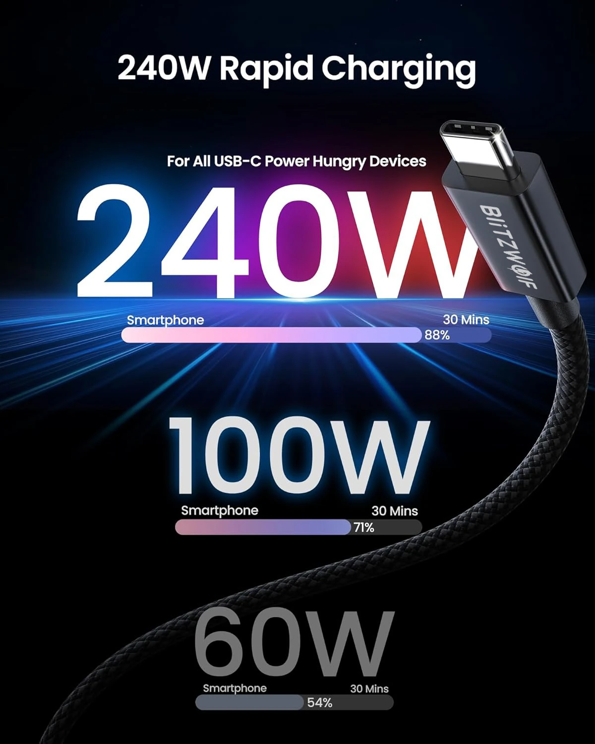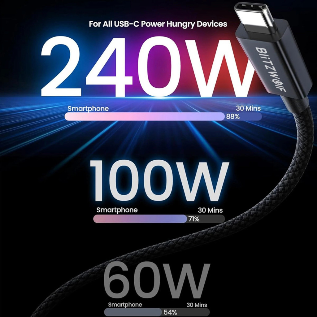 BlitzWolf® BW-HCD8 Thunderbolt 5 is a USB Type-C cable that will be your faithful companion for decades in terms of charging performance, data transfer speed and quality, whether it's Windows, Android or MacBook devices. It's not just a cable - it's an investment in maximum speed and uncompromising efficiency.