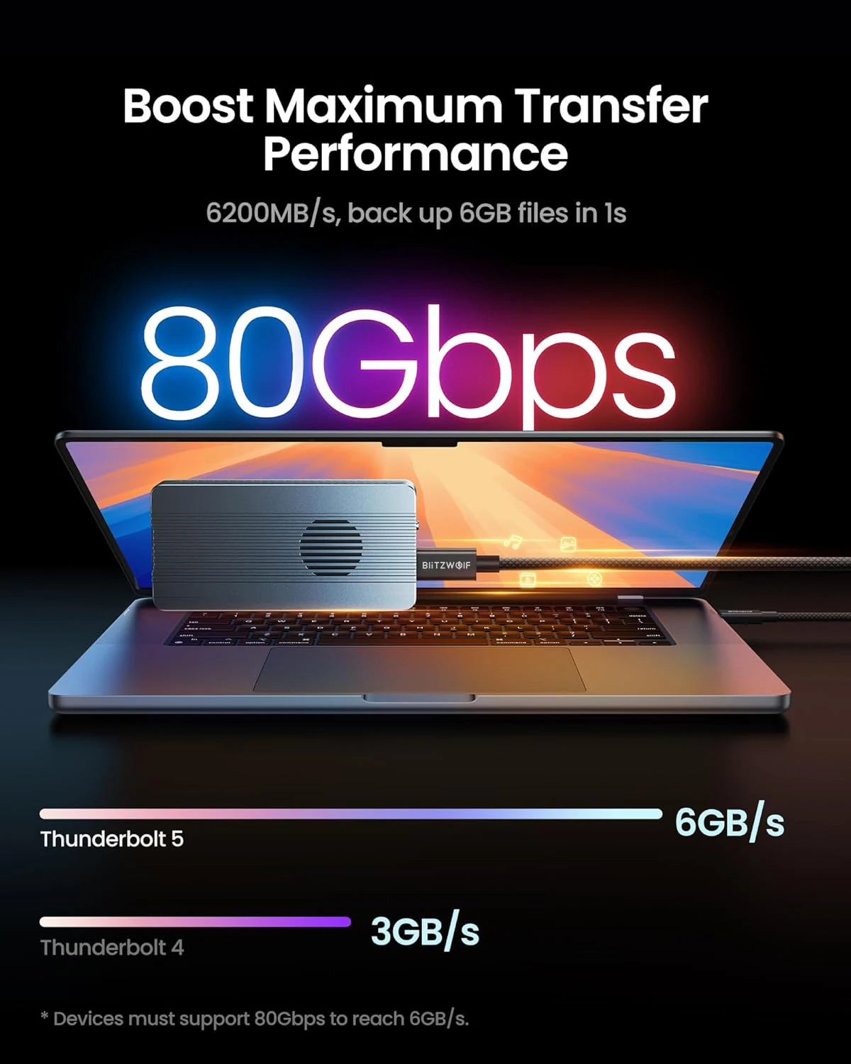 Cable requirements: To achieve full 80/120 Gbps speeds, you need a Thunderbolt 5 certified cable (such as the BW-HCD8) and compatible devices.