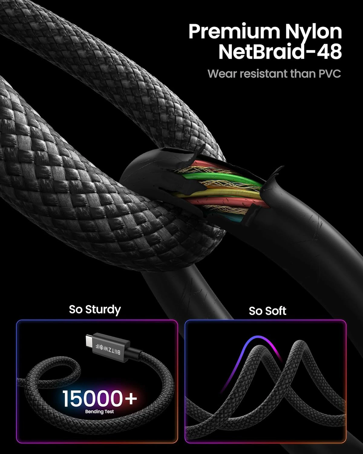 The BlitzWolf® BW-HCD8 is not only fast and powerful, but also durable. The cable is protected by a premium Kevlar fiber cover to withstand everyday use. This military-grade material makes it extremely resistant to abrasion, tearing, and tangling. We have reinforced the connectors with a break-resistant design and tested it for over 15,000 bend cycles to ensure a long service life. This cable is built to withstand kinks and work reliably for years to come.